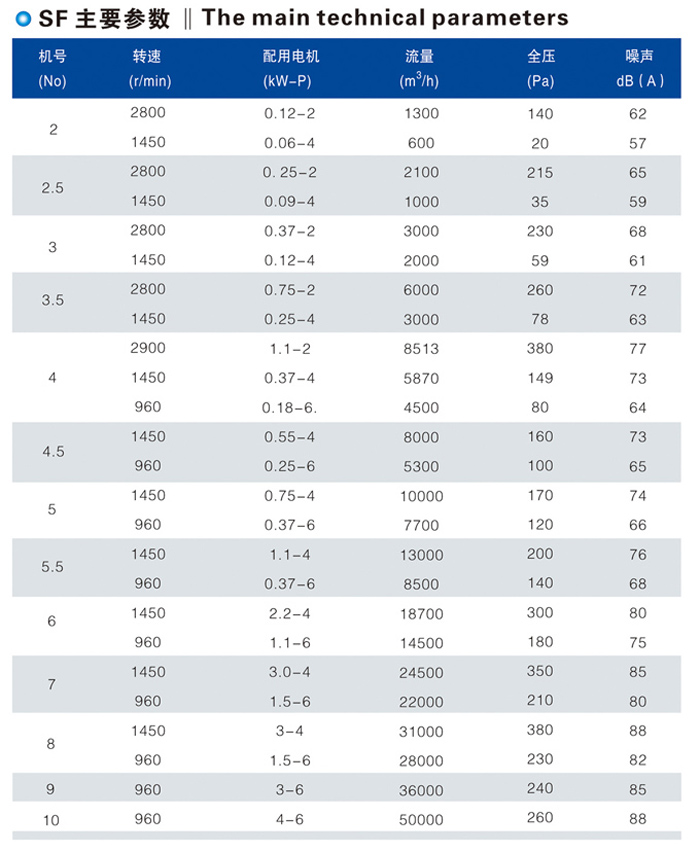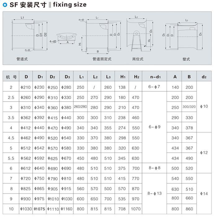 SF系列風(fēng)機(jī)按葉輪直徑分12個機(jī)號,按使用要求分管道式、固定式、壁式、崗位式四種。